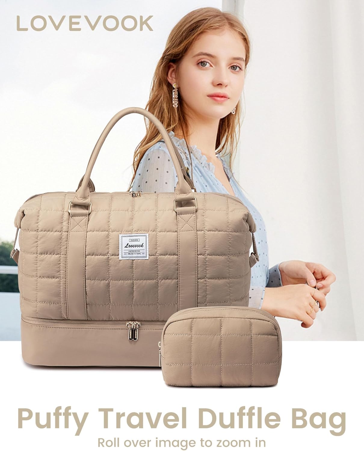 Introducing the ultimate travel companion – the Large Duffle Bag for Travel in a stylish Coffee color! This Puffer Weekender Bag is designed with women travelers in mind, offering both functionality and fashion in one sleek package.